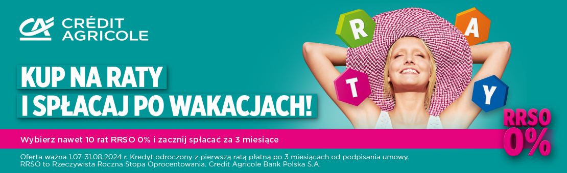 Kupuj wygodnie, wybierz raty banku Credit Agricole. Sprawdź jakie to proste: - wybierz produkt który Cię interesuje gdy wartość koszyka wyniesie minimum 500 zł skorzystaj z rat banku Credit Agricole, - wypełnij wniosek online i poczekaj na decyzję kredytową, - przelej 1 zł i załącz zdjęcie dowodu osobistego ( o ile będzie to wymagane), - potwierdź zawarcie umowy kodem z SMS, - umowę otrzymasz na swoją skrzynkę e-mail, a sklep zacznie realizować Twoje zamówienie.